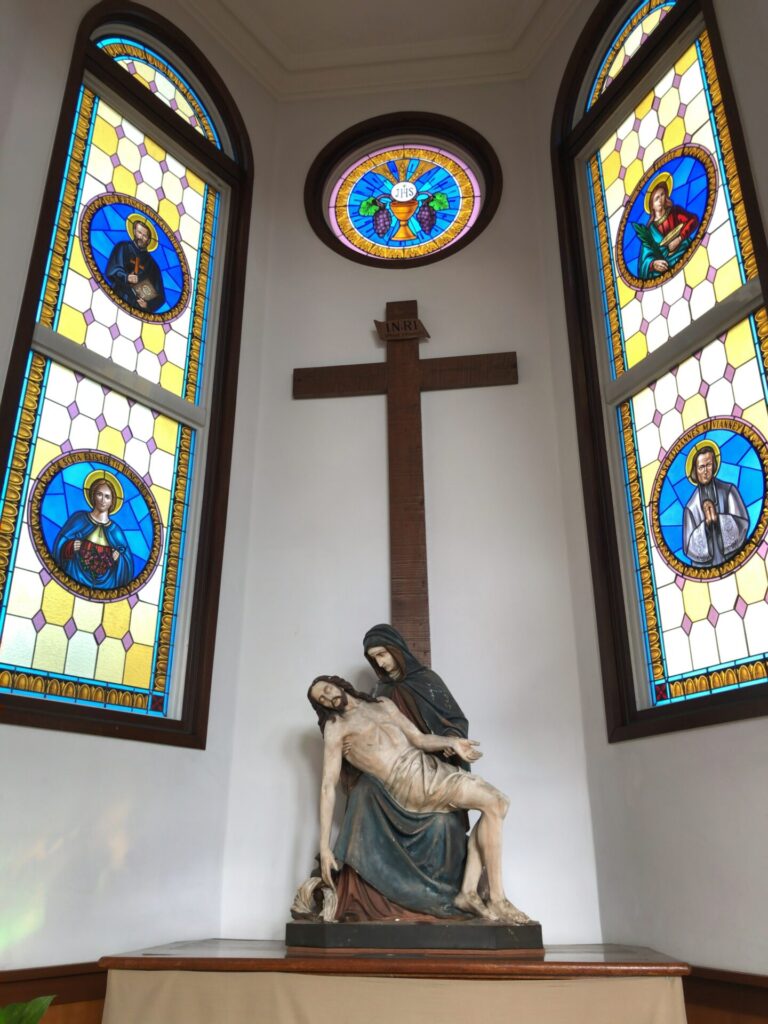 ピエタ像、INRIの十字架、そしてこのステンドグラスが同じ空間に並んでいるのは、「受難 → 犠牲 → 救い → 希望」という流れを空間全体で表現しているようです。
