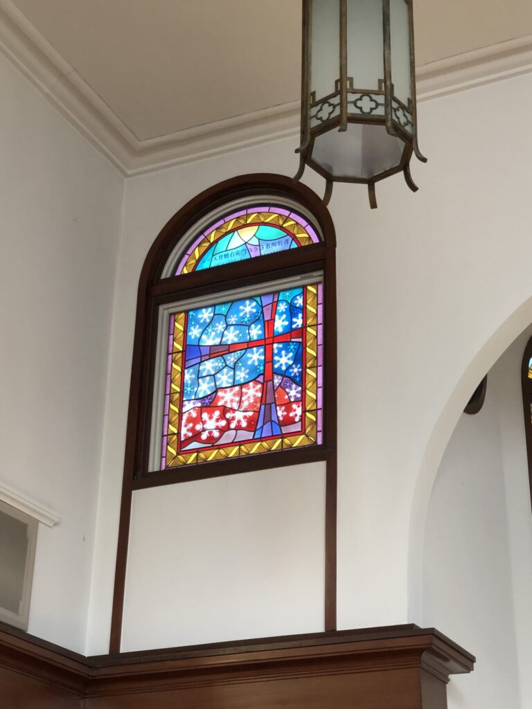 その上にある聖杯と葡萄のステンドグラスに書かれている「JHS」。
