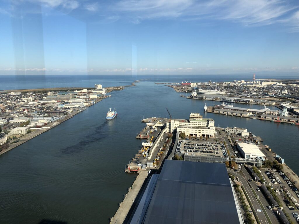 信濃川が日本海にそそぐ終点がよくわかるし、行きかう船もたくさん見えて、ずっと眺めていられます。