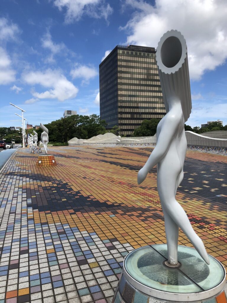 紫川にかかる中の橋には、ペンネ人間がずらり。福田繁雄さんのアート作品です。