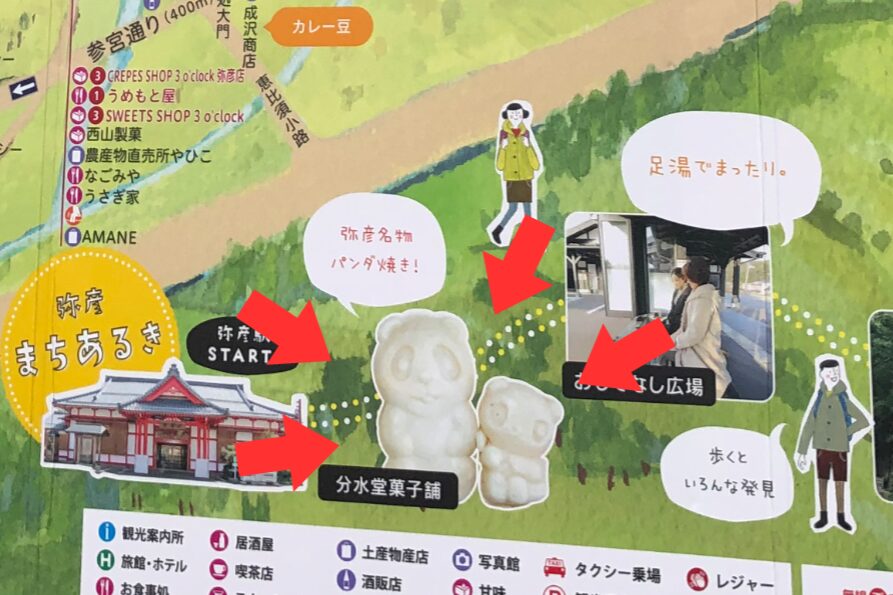 ちなみにパンダ焼きは、駅前にあった「弥彦まちあるきMAP」の看板にも載っていす。