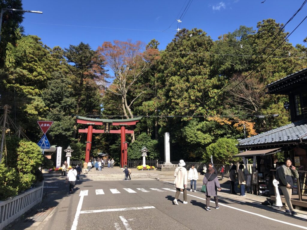 大イチョウを後にして、さらに進むと彌彦神社の赤い鳥居が見えてきました。