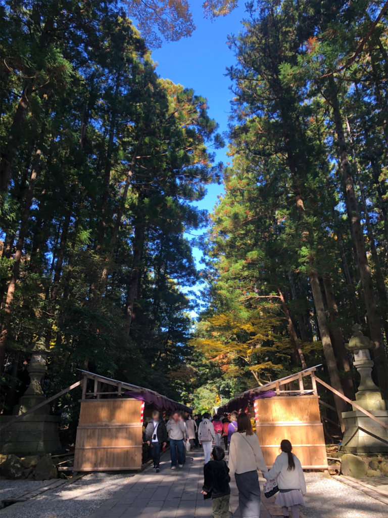 鳥居をくぐると、両脇にまっすぐ伸びる杉の並木が綺麗です。